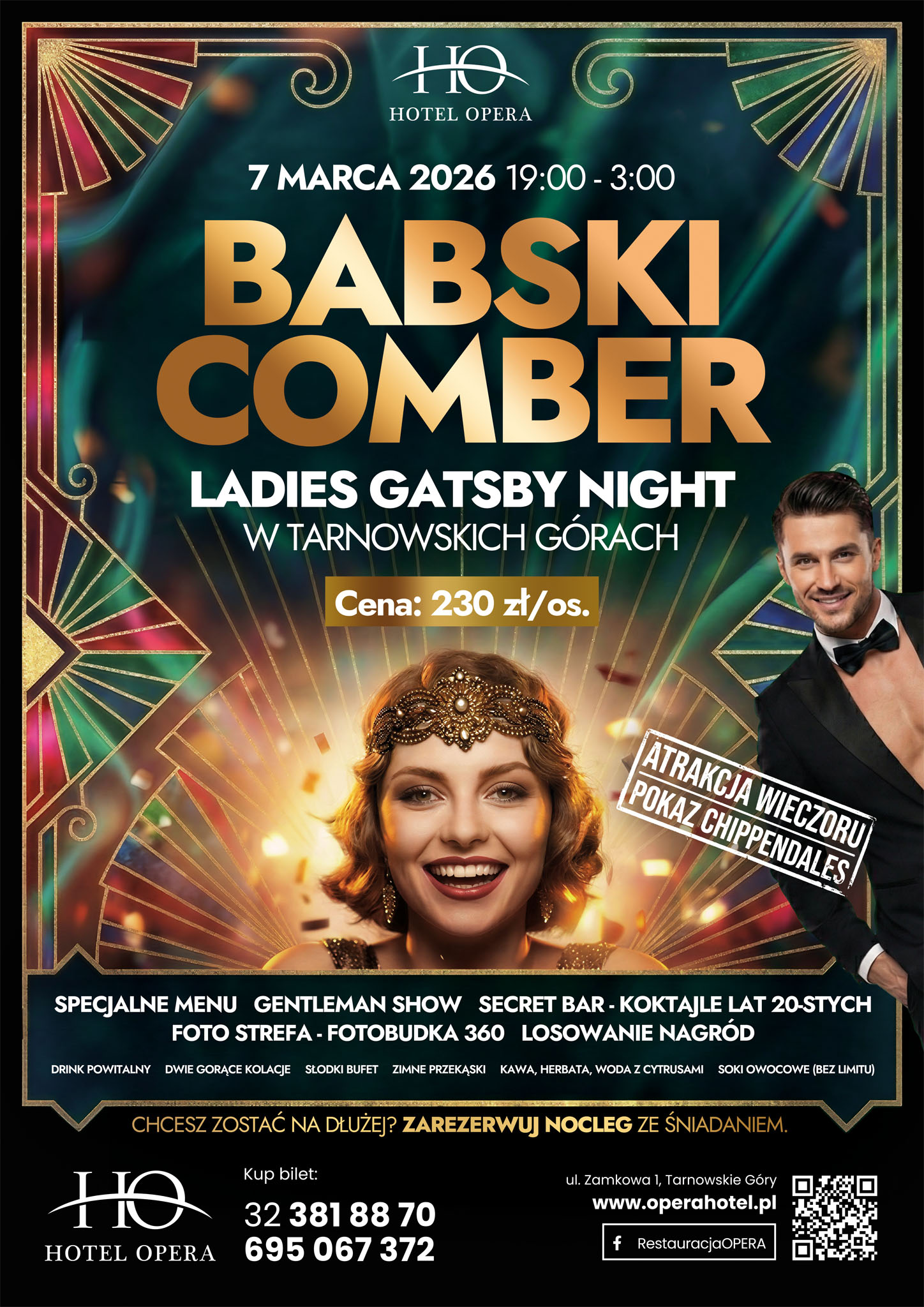Szykujcie pióra, perły, cekiny i stroje z frędzlami, które będą wirować w rytmie największych tanecznych hitów. Tej nocy nasza sala zamieni się w luksusową rezydencję, w której blask złota spotyka się z tajemniczą czernią